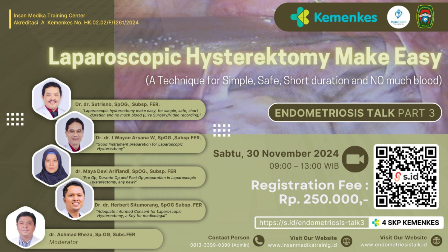 Insan Medika Training Center bekerjasama dengan POGI Cabang Malang mengadakan Kegiatan Seminar Endometriosis Talk Part 3: Laparoscopic Hysterektomy Make Easy (A Technique for Simple, Safe, Short Duration and NO Much Blood) via Zoom