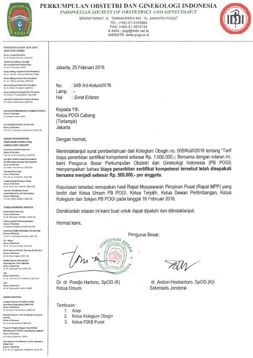 Pemberitahuan Kenaikan Tarif Biaya Penerbitan Sertifikat Kompetensi Obstetri & Ginekologi