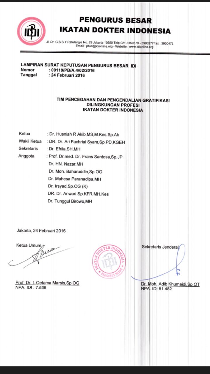 SK PB IDI No. 00119/PB/A.4/02/2016 Tentang Tim Pencegahan & Pengendalian Gratifikasi di Lingkungan Profesi Ikatan Dokter Indonesia