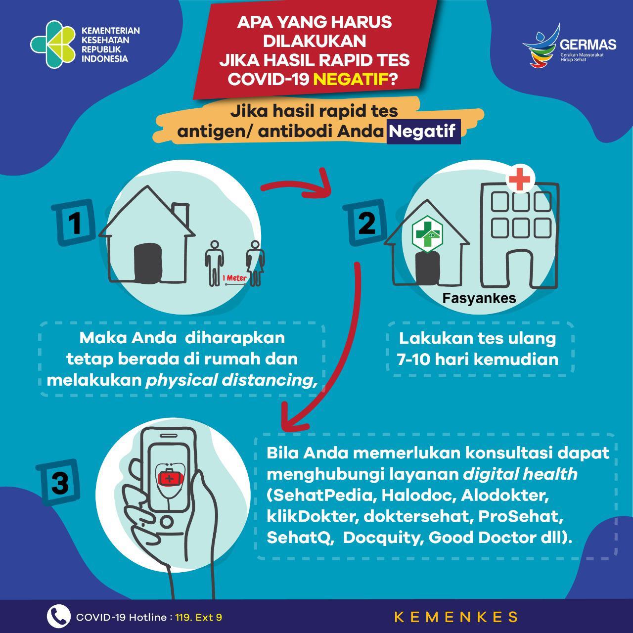 Jika hasil rapid tes antigen/antibodi Anda negatif, maka anda diharapkan tetap berada di rumah dan melakukan physical distancing